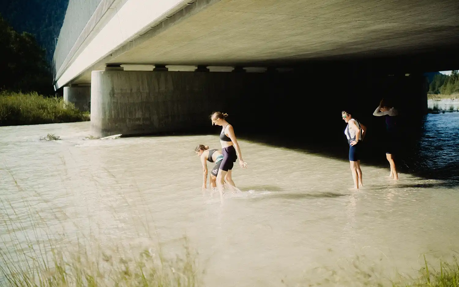 Dann: Ankunft im Explorer Hotel Garmisch. Die Räder werden abgestellt, Helme fallen in die Ecke. Einige springen direkt in die Loisach hinter dem Haus – das Wasser eiskalt, das Lachen laut. Keine Ahnung, ob es das Wasser ist oder die Endorphine. Wahrscheinlich beides. Oben im Hotel warten Waschstation, Sauna, Bar. Alles gewohnt, alles unaufgeregt – und genau richtig nach so einem Tag.