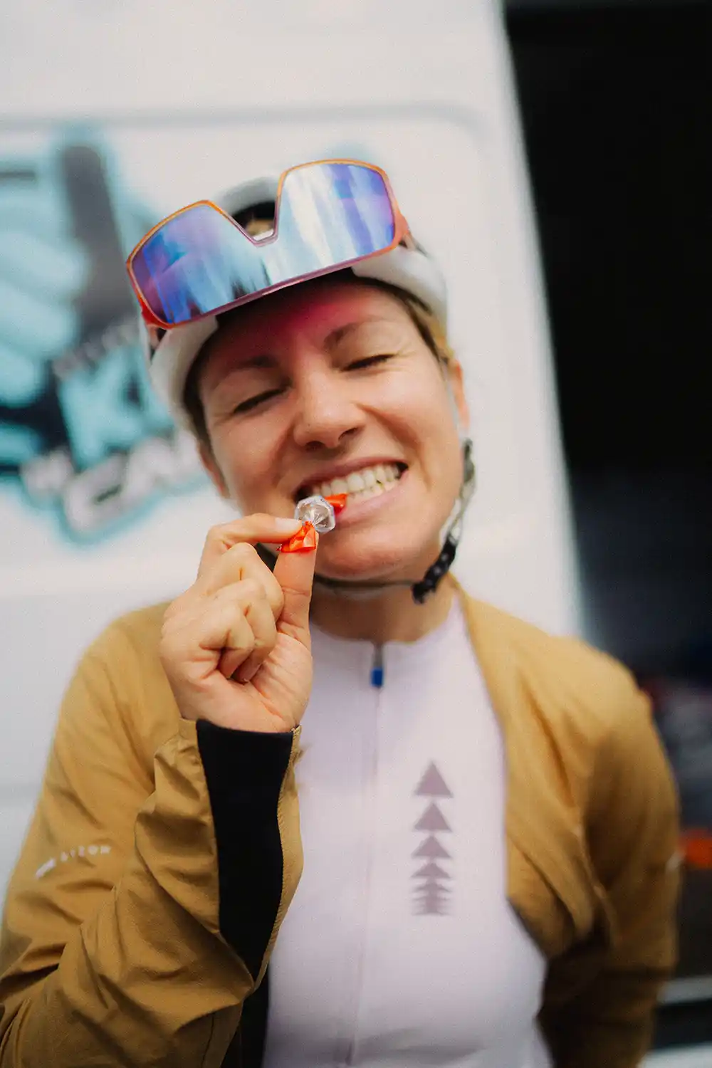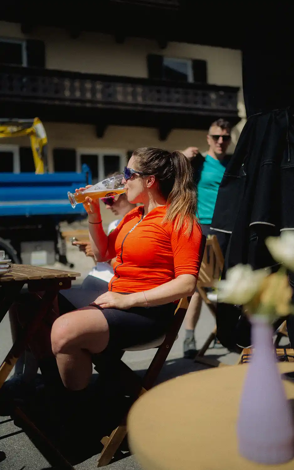 „Was mich hier berührt,“ sagt sie, „ist das Miteinander." Keine Show, kein elitärer Vibe – einfach echtes Aufeinander-Achten.“ Als ich sie frage, was sie am meisten mitnimmt, sagt sie ohne zu zögern drei Worte: Verbundenheit. Vielfalt. Stärke. Und dann beschreibt sie es so, wie man es besser nicht sagen kann: „Kurz vor den Gipfeln. Wenn du fast nichts mehr im Tank hast, aber dann dieses Panorama siehst – dann weißt du, wofür du fährst.“