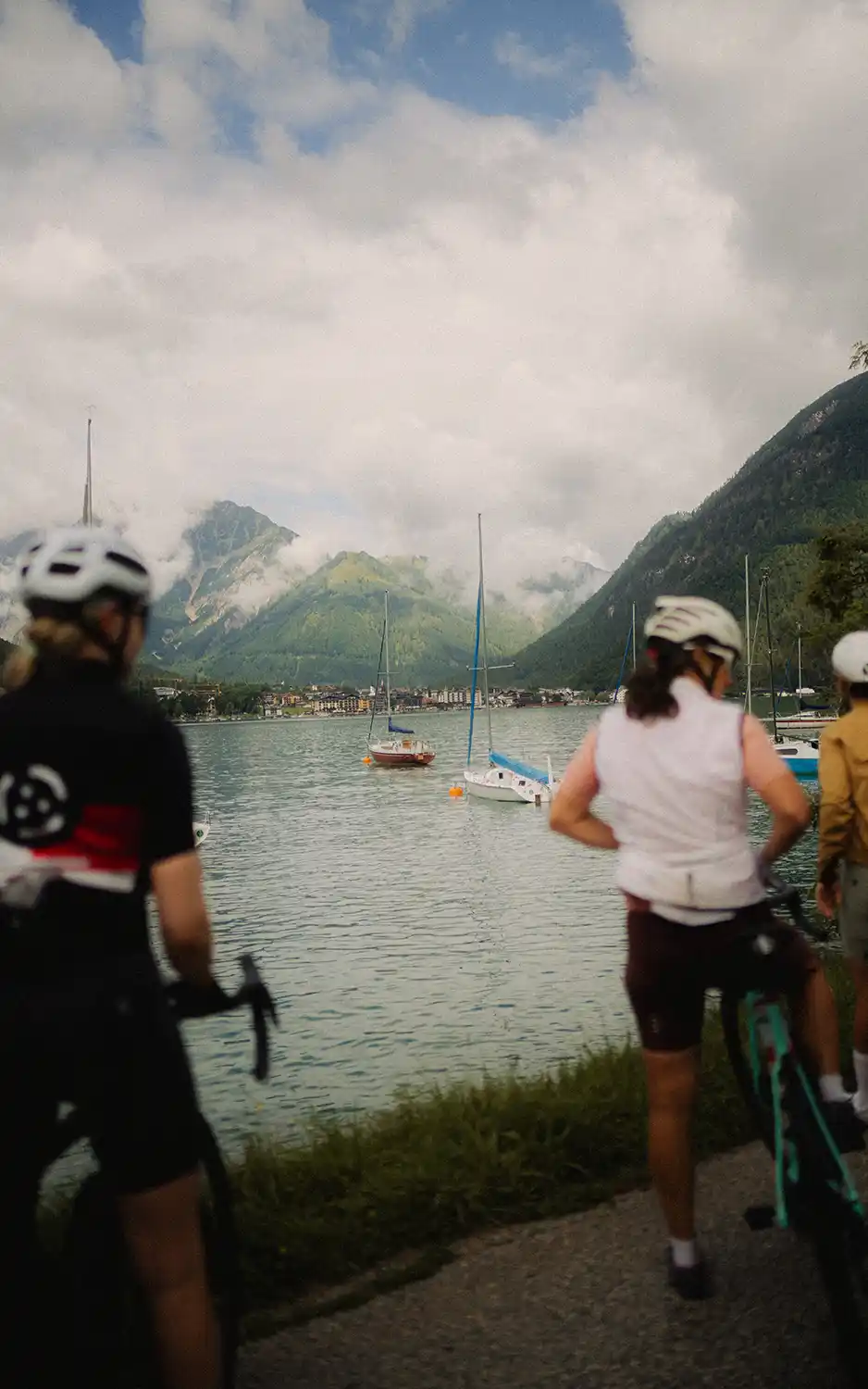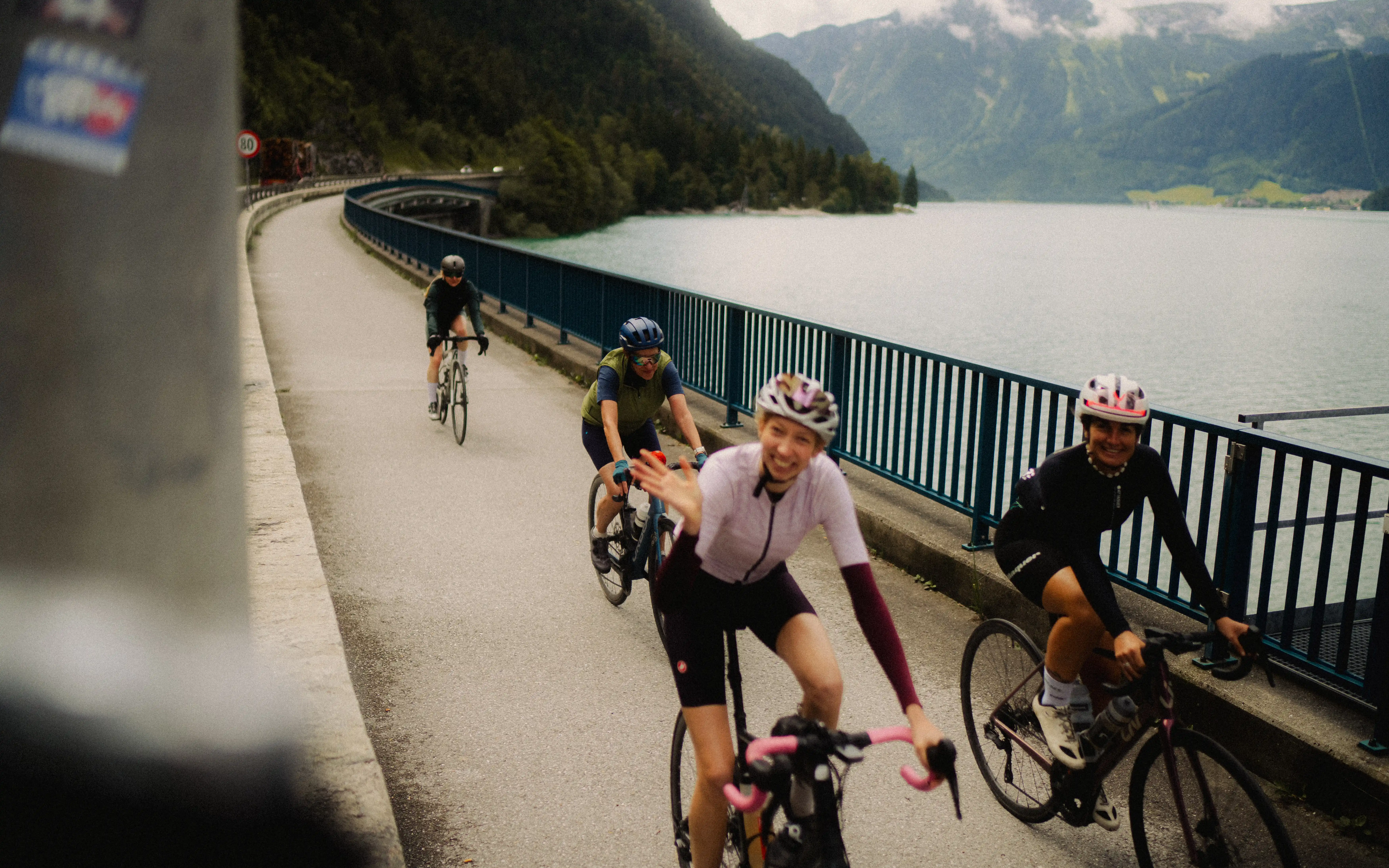 Die ersten Kilometer rollen locker an. Im Zillertal geht’s flach dahin, dann wird’s ernster: der Anstieg zum Achensee. Nicht brutal, aber ehrlich. Oben wartet das Karwendelgebirge – und ein Moment, der still macht. Die Gruppe hält an. Nicht, weil jemand muss, sondern weil alle wollen. Es ist einer dieser Stopps, bei dem man das Handy nicht zückt sondern stattdessen einfach mal in die Landschaft schaut.