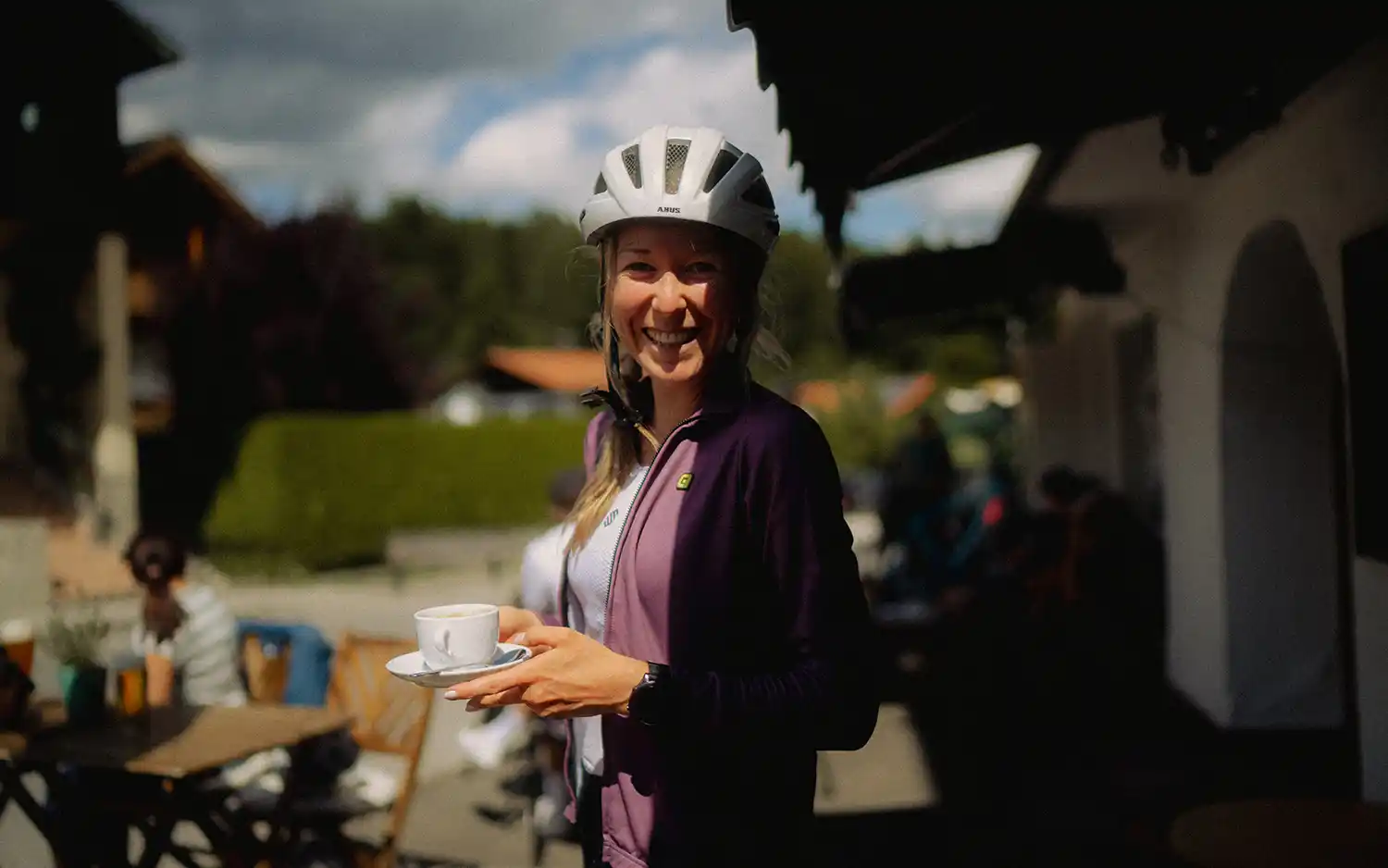 Mittag, Grainau. Ein kleines Café, draußen knirscht der Kies unter den Radschuhen. Espresso, Cola, Apfelkuchen. Ich setze mich zu Theresa, 35, aus Hessen. Sie pausiert heute, Knie zwickt. Aber sie ist voll drin – emotional, sozial, mittendrin eben. Sie kommt eigentlich aus dem Triathlon, kennt auch den Allgäu Triathlon gut. Aber das hier? Das fühlt sich für sie anders an.